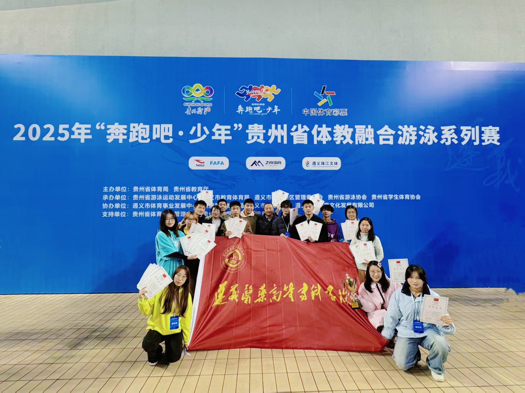 2025年“奔跑吧·少年”贵州省体教融合游泳系列赛于10月24日-26日在遵义奥体中心游泳馆开赛。我校派出14名运动员与来自全省184支代表队的1800余名运动员同台竞技,虽然与高水平运动队和体育院校分在同组,但我校游泳健儿顽强拼搏,最终斩获1金3银2铜共计21项获奖的优异成绩,团体总分第五名,位列高职院校第一名。本次比赛由王太权、陈义、刘华琼三位老师担任教练。我校一直以“体教融合”为办学特色,积极推行“1+2+1”体育育人模式,为学生提供多种体育项目锻炼平台。此次比赛成绩充分...