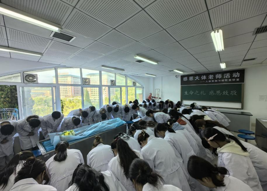 为缅怀遗体捐献者的无私奉献,引导同学们树立敬畏生命、感恩奉献的意识,自10月中旬以来,我校以班级为单位在解剖实验室开展“生命之礼、感恩致敬”主题感恩活动。解剖教研室全体教师、25级全体学生共同参与,以最诚挚的仪式向“无言良师”表达敬意。仪式简短而庄重,同学们身着白大褂,在实验台前整齐肃立。老师简洁介绍“大体老师”的由来,同时强调开展感恩活动的重要意义。随后,学生代表带领全班同学庄严宣誓,立志成为一名有温度、有技术的健康守护者。最后老师带领全体同学向“无言良师”行三鞠躬礼并叮嘱同...