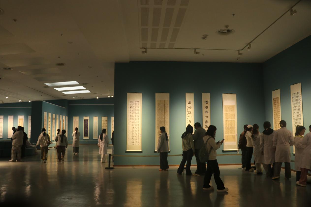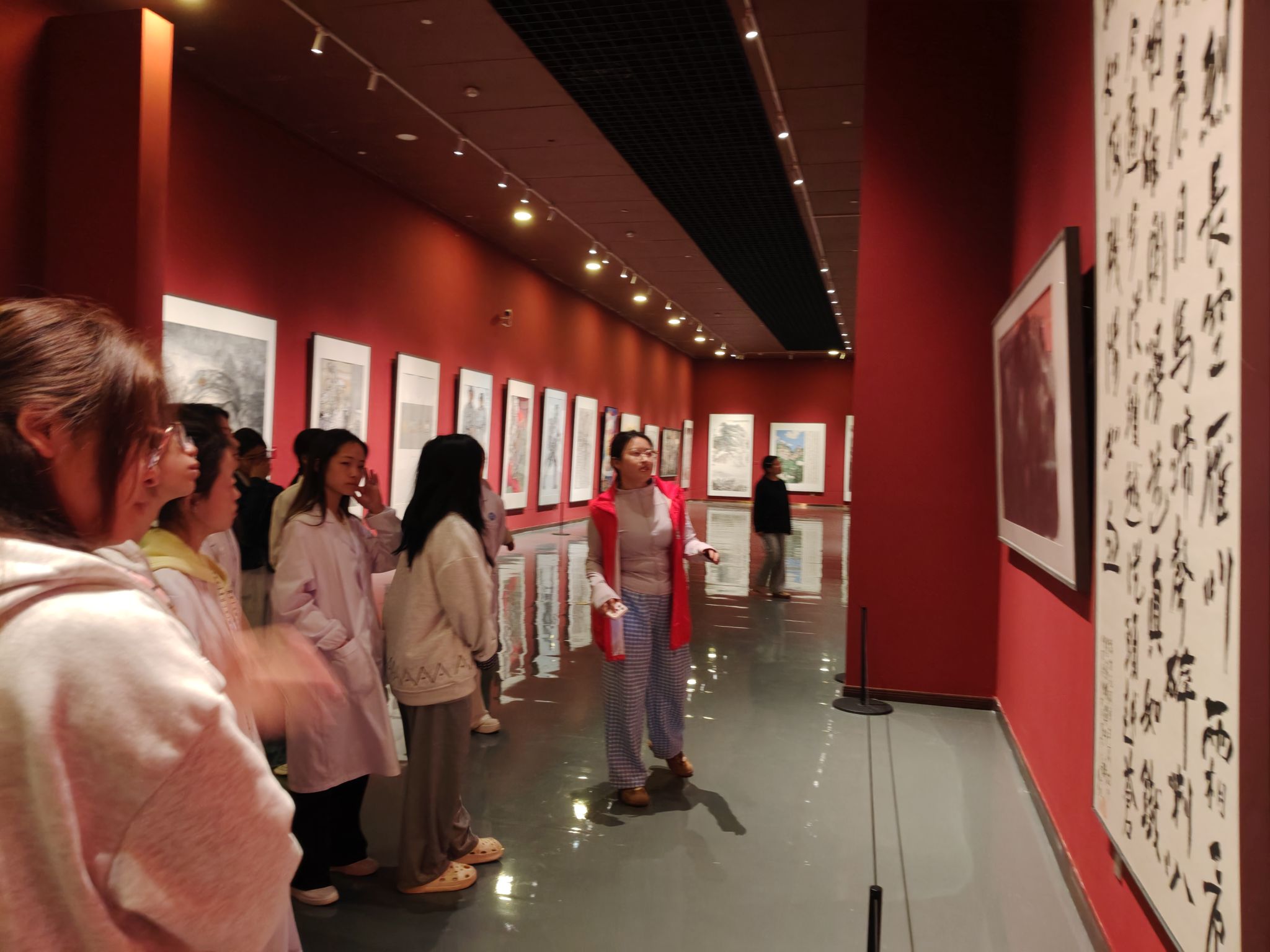 师生们在美术馆讲解员的带领下,有序参观了馆内各类展览。恰逢“回归自然 独抒性灵——陈危冰田园诗意画展”正在展出,该展览汇聚了艺术家田园山水创作精粹,以诗入画、以墨传情,将江南水乡的温润雅致与黔北大地的灵秀厚重完美交融,尽显“诗书画印”合一的文人传统魅力。此外,师生们还参观了馆内“红城之光”——遵义与中国革命历史主题美术作品展、“墨韵芳华·书绘巾帼”遵义市第三届女子书法作品展及各类馆藏精品,近距离欣赏书法、绘画、雕塑等多种艺术形式的作品,感受传统艺术与时代精神的碰撞。